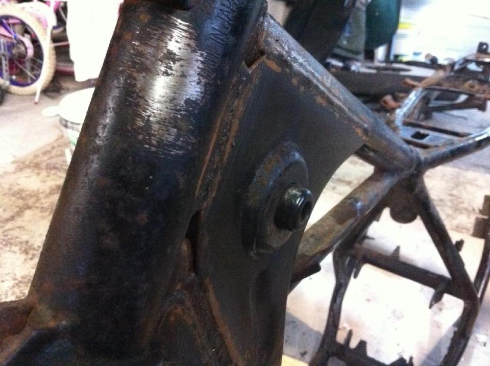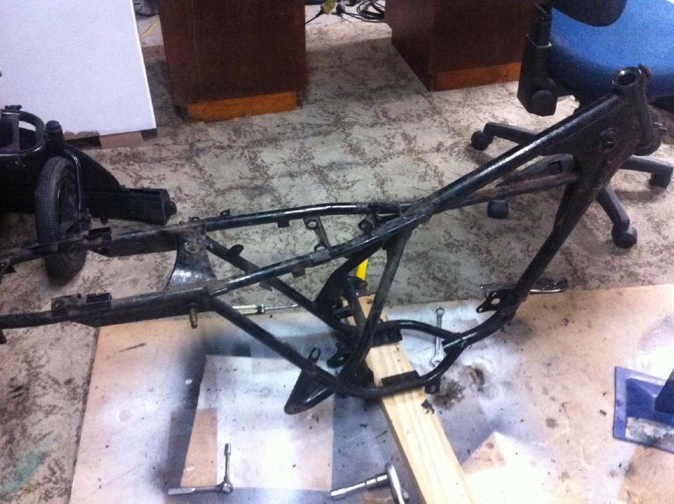 Now that the frame is bare, I can see that it’s thankfully in really good condition. I’ve priced up getting it and the rear swing-arm bead blasted and powder coated, but it’ll cost more than the entire bike cost to begin with, so my wife and I (and probably the kids if I can bribe them) will need to get that elbow grease out again to clean and strip the frame back as much as possible. Once it’s clean, then several coats of some good durable enamel should be plenty good enough for now.