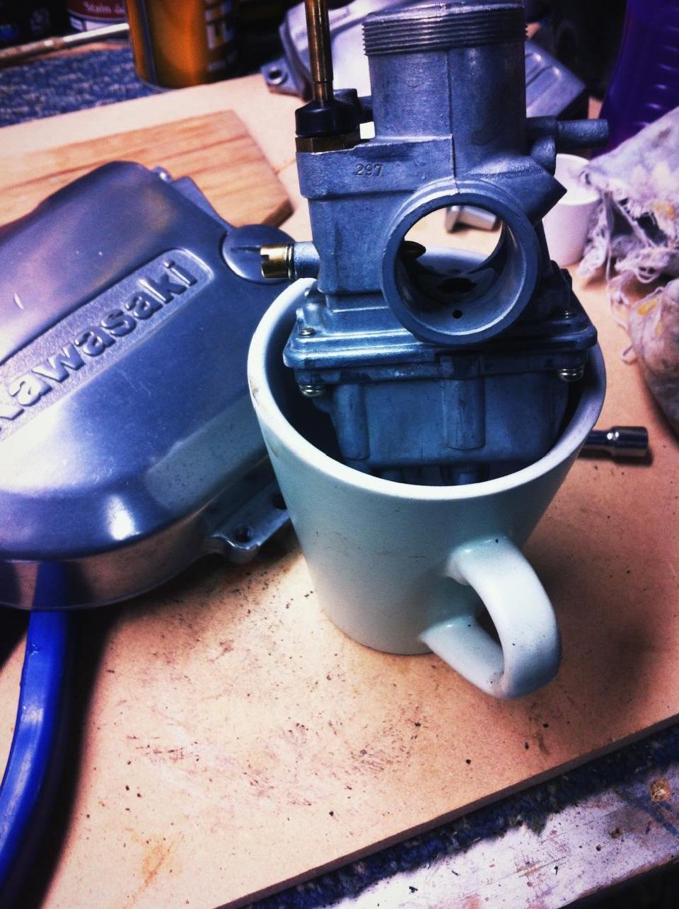 I whipped the engine block out a few nights ago as well, so my work bench is getting a little crowded now. One reason I chose this specific bike to restore was that it’s pretty bloody simple, so it only took me half an hour or so to strip, clean and rebuild the carb - which now takes pride of place in one of the many empty coffee cups.