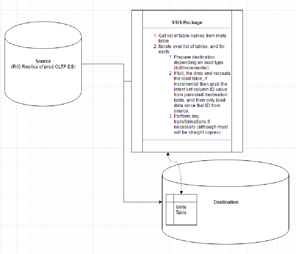 So my plan is to have table metadata stored in a table on the destination (Azure Data Warehouse) database, which is queried by the package and stored in package variables. I’ll then iterate over the list of tables, do my ETL (depending on what kind of load I’m doing), and finally load the data from the source system. Sounds simple enough (… and it is), so let’s get started.