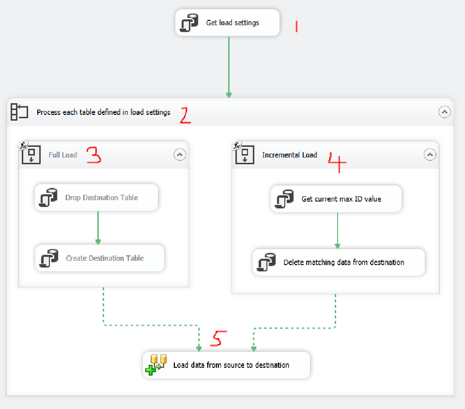 3. There are separate sequence containers for Full and Incremental loads. Their disabled states are set via an Expression which is based on the value from the [LoadType] column grabbed from the [LoadConfiguration] table above. So, if we’re doing a full load, the Incremental load container will be disabled, and vice versa. Another (possibly better) way of doing this would be to use precedence constraints with expressions to control the path of execution .